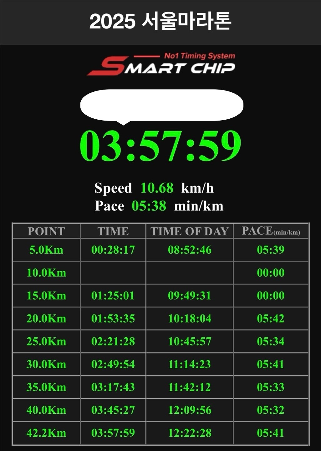 처음부터 페이스를 끌어올릴 수가 없어서 4:00 페이스메이커와 함께 30km 지점까지 함께 달렸다. 이후 남은 12km는 스스로 페이스를 유지하며 무사히 결승선을 통과할 수 있었다.